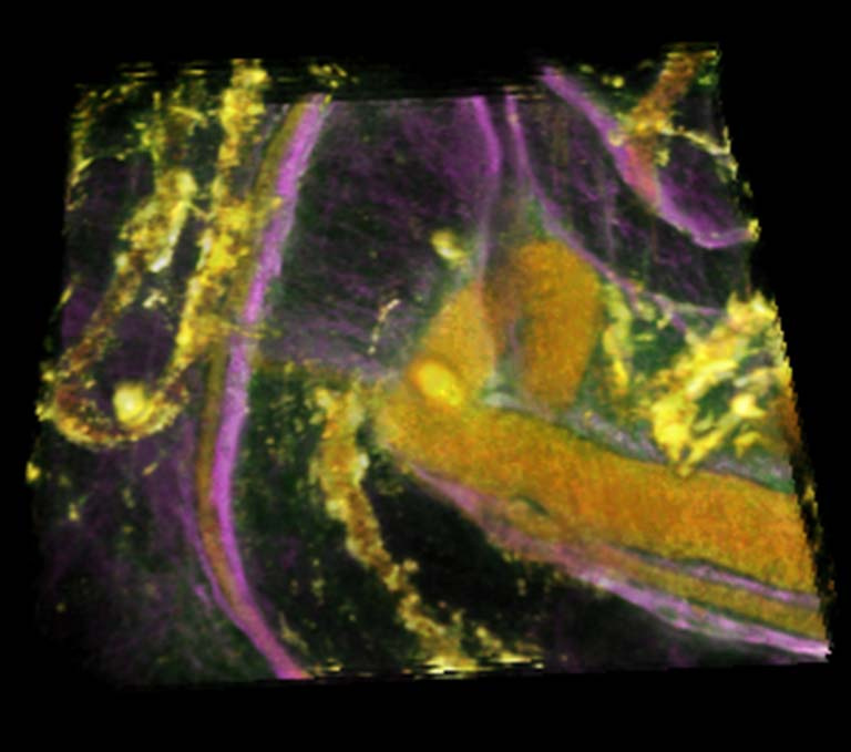 "Tumors require a steady supply of energy to maintain their rapid growth rates within the body. To achieve this impressive feat, tumors recruit nearby blood vessels to provide sufficient nutrients and oxygen. Inside the tumor, these newly-formed ‘angiogenic’ blood vessels appear as long and winding channels. We are studying the effects of localized heating of the tumor vasculature as it relates to enhancing the accumulation of therapies in tumors. We have found that tumor vessels exposed to a single round of heating by gold nanorods become more permeable to therapeutic and diagnostic agents, but interestingly, we have observed that vessels become more resistant to heating after multiple rounds of heating. We took this image to directly visualize blood flow and perfusion in the tumor following two rounds of gold nanorod heating. To [our] knowledge, this project depicts the first instance of gold nanorods resident in tumor tissue in a living subject."
