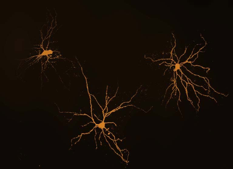 "This image shows two neurons of the amygdala, a brain region involved in emotional learning and processing. Before imaging the neuron, we recorded their electric activity and filled them with a small molecule that allows imaging and reconstruction of the neurons morphology. The main goal of this study is to test whether amygdala neurons present different changes at the electrophysiological as well as anatomical level, depending on previous learning experiences of the animal."