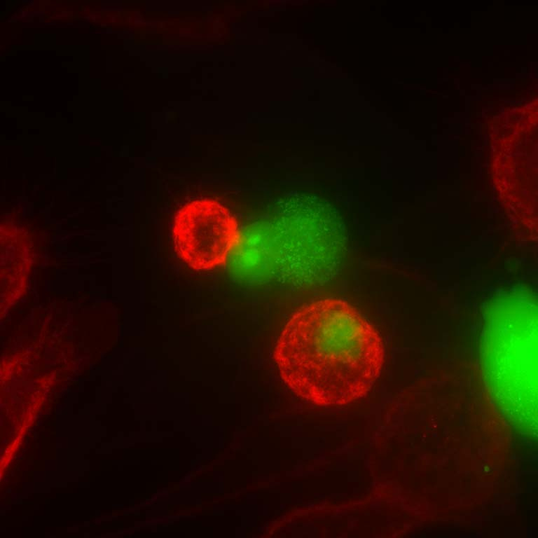 I engineer protein constructs that activate immune cells through Fc gamma receptor binding to kill targeted tumor cells. This image shows immune cells (red) engulfing tumor cells (green) that are targeted with an antibody.