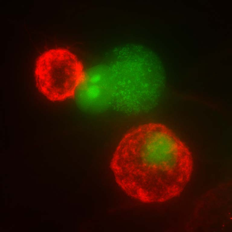 I engineer protein constructs that activate immune cells through Fc gamma receptor binding to kill targeted tumor cells. This image shows immune cells (red) engulfing tumor cells (green) that are targeted with an antibody.