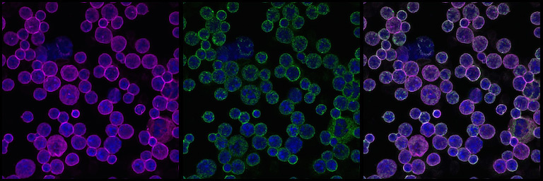 "After detecting changes in the dynamics of nuclear lamina expression during terminal erythroid differentiation of mouse fetal liver cells, we were curious as to the corresponding localization of the of these lamins over time – in other words, where on the nuclear envelope are the lamins positioned. Through [this work] we learned that changes in nuclear lamina thickness may explain the resulting dynamics in nuclear lamin expression we previously observed. We were [also] able to notice an important relationship between the areas of high DNA and lamina density by costaining nuclear DNA with lamin proteins. These images show liver cells stained for Lamin A (green), Lamin B (pink), and DNA for reference (blue)."
