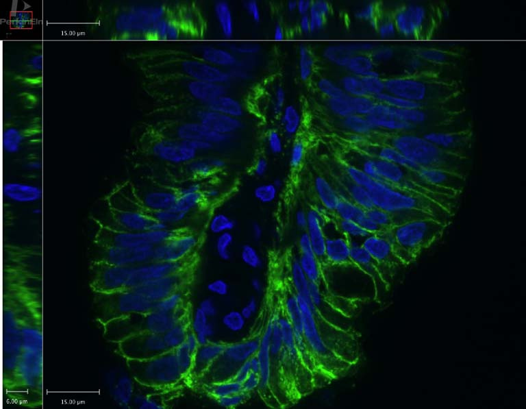 This is a cross section of a surgically removed human colon polyp. The green fluorescent stain is targeting Epithelial Cell Adhesion Molecule (EpCAM), a marker specific to epithelial cells. The blue fluorescent stain is Hoechst, a stain that marks the DNA of all cell types. I took this image to confirm that my EpCAM antibody is able to exclusively target epithelial cells, and not other cell types. Because only the epithelial lining of the polyp has been stained green, and not the fibrovascular core which contains different cell types, I confirmed that my EpCAM antibody exclusively targeted epithelial cells.