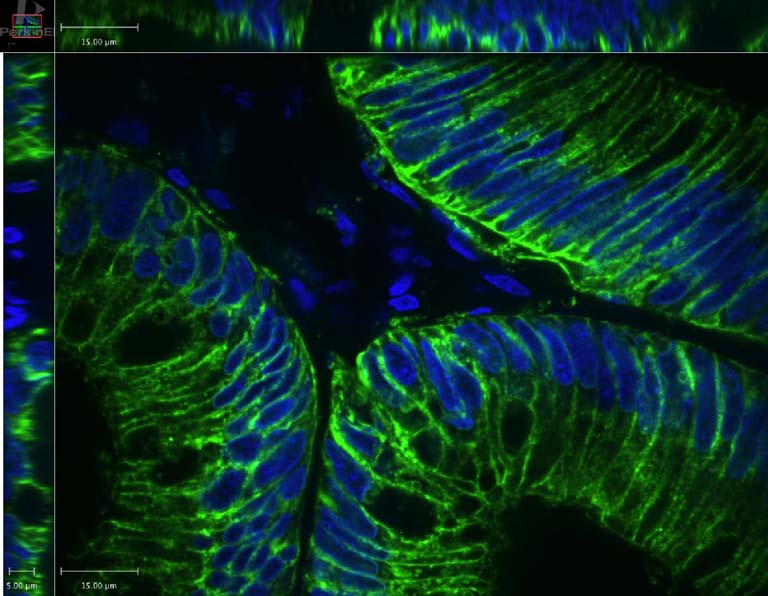 This is a cross section of a surgically removed human colon polyp. The green fluorescent stain is targeting Epithelial Cell Adhesion Molecule (EpCAM), a marker specific to epithelial cells. The blue fluorescent stain is Hoechst, a stain that marks the DNA of all cell types. I took this image to confirm that my EpCAM antibody is able to exclusively target epithelial cells, and not other cell types. Because only the epithelial lining of the polyp has been stained green, and not the fibrovascular core which contains different cell types, I confirmed that my EpCAM antibody exclusively targeted epithelial cells.