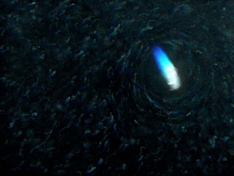 "Artificial Bacterial Flagella (ABFs) are helical microrobots that can be remotely controlled using magnetic fields, mimicking the propulsive motion of bacteria E. Coli. In this image you can see the trajectory of an ABF (16 micrometers in length) and the dynamics of the nanoparticles flowing around it. An Artificial Bacterial Flagellum could be used to improve the tissue penetration of nanoparticles in tumor tissue by pumping them out of vessels and through diffusive tumor environments."