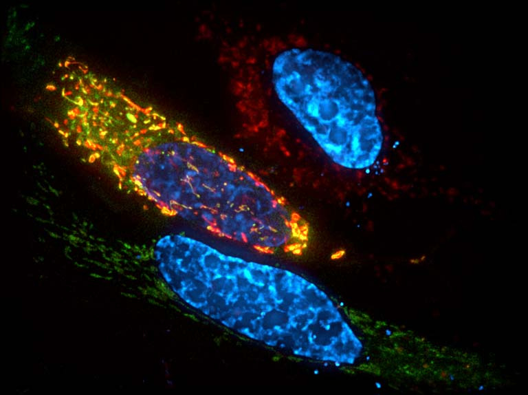 Many cells undergo programmed cell death after suffering irreparable amounts of DNA damage. Numerous anti-cancer drugs induce programmed cell death by acting as DNA damaging agents. However, cancer cells can frequently circumvent the major programmed cell death pathway of apoptosis, thereby diminishing the effectiveness of anti-cancer chemotherapy. We have recently identified a key protein named ALKBH7 that is required for an alternative cell death pathway known as programmed necrosis. In this image, we show that ALKBH7 (green) is found in the mitochondria (red), the major energy producing factory in the cell. By localizing to the mitochondria, ALKBH7 presents a new target for therapeutic intervention to kill cancer cells that are resistant to apoptotic cell death.