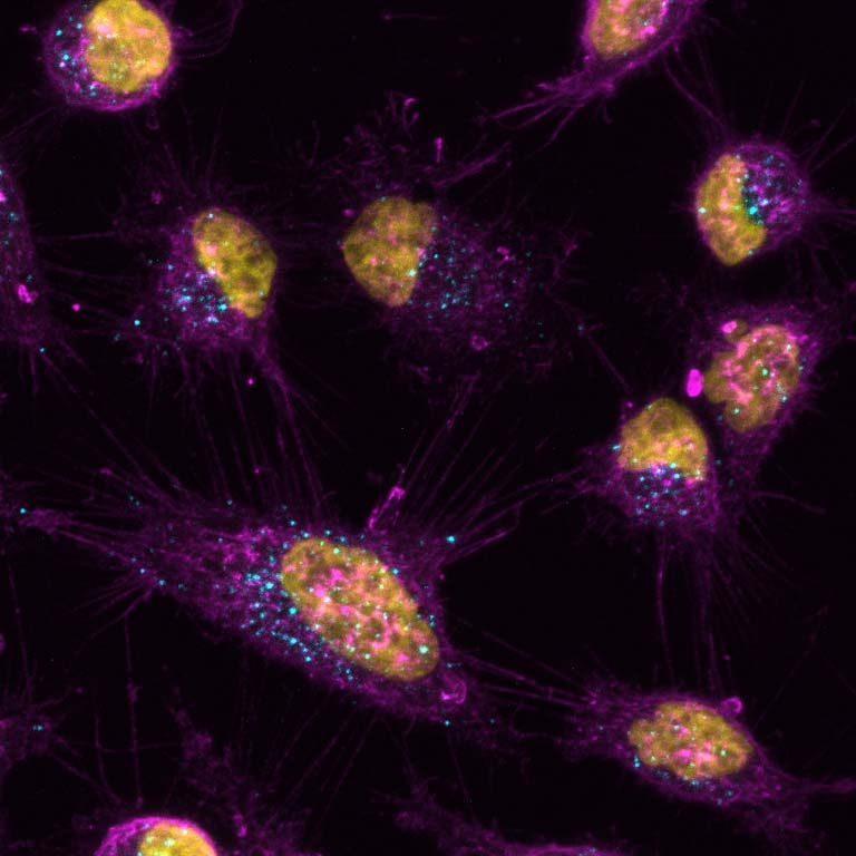 This image, captured by Omar Khan and Edmond Zaia, shows nanoparticles delivering siRNA to the cytoplasm of cervical tumor cells.