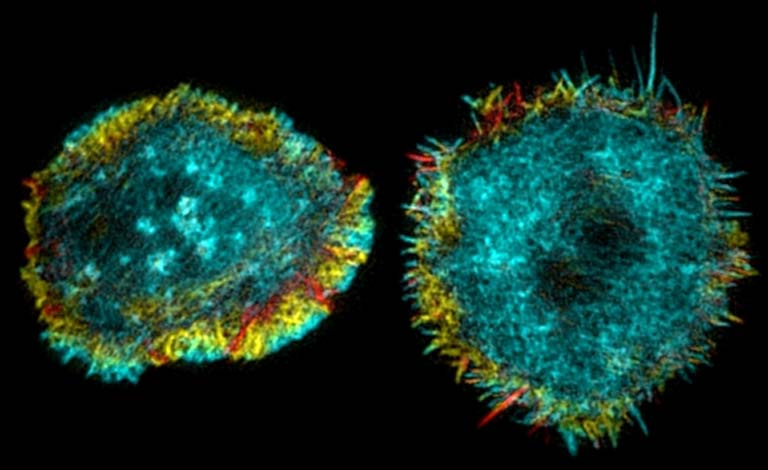 The image shows T cell skeleton that serves as ‘signal amplification hotspot’ when cells are sensing antigens (‘patches’ in the center of left image). Treatment of T cells to remove these hotspots specifically (right image) results in defective T cell activation, even though antigen is present. The pseudocolors reflect on the shape of the contact interface of the cell with the antigenic surface (not shown). Blue is closest to the antigenic surface and red is farthest.