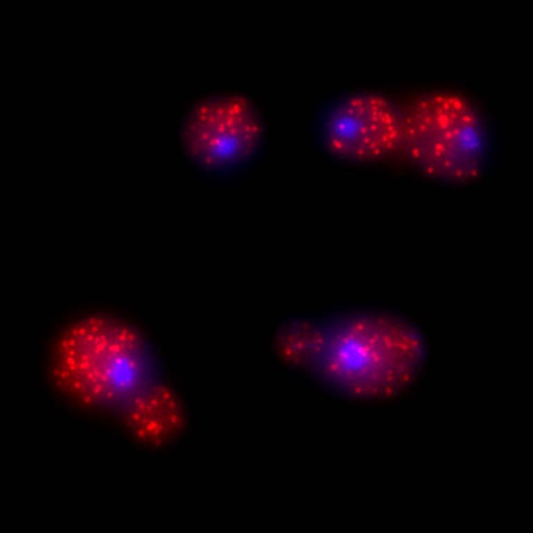 Cancer starts as a cellular process gone awry in a very small subset of cells, finally manifesting as uncontrolled proliferation. Hence it is essential to develop tools to monitor the expression of key genes, not just in bulk cell populations, but at the level of the single cell. These are yeast cells in which single transcripts of a gene called RNR4 can be seen in red.