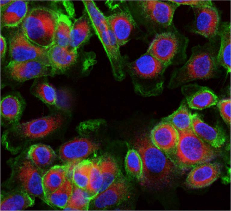 This image was taken to investigate the targeting capabilities of the nanoparticles for a given cancer cell type. It shows the flooding of cancer cells with targeted medicine to deliver potent cocktails of drugs. This technology is one of the workhorses of the Hammond lab towards the manufacturing of new and innovative therapies for cancer.