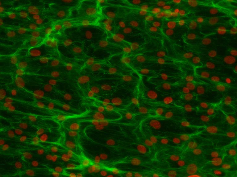 Alternative splicing of genes results in multiple proteins from the same gene sequence in the DNA. We aim to understand the regulation and function of alternative splicing of Fibronectin and other genes in the vascular response to damaging types of blood flow. This image shows the extracellular fibrillar matrix produced by the endothelial cells which line blood vessels under flow, as revealed by immunofluorescent staining.