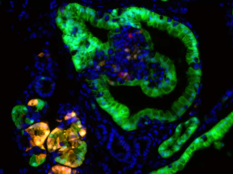 By tracking the green cells that eventually become tumors, we can identify the origins of pancreatic cancer development and the behavior of these cells during the tumor formation process. Cells with complete loss of p53 grow wildly and take over the tumor, often engulfing their counterparts that retain p53. This image shows these cells in early-stage tumors. See what they look like in normal pancreatic tissue here and early-stage tumor development here.