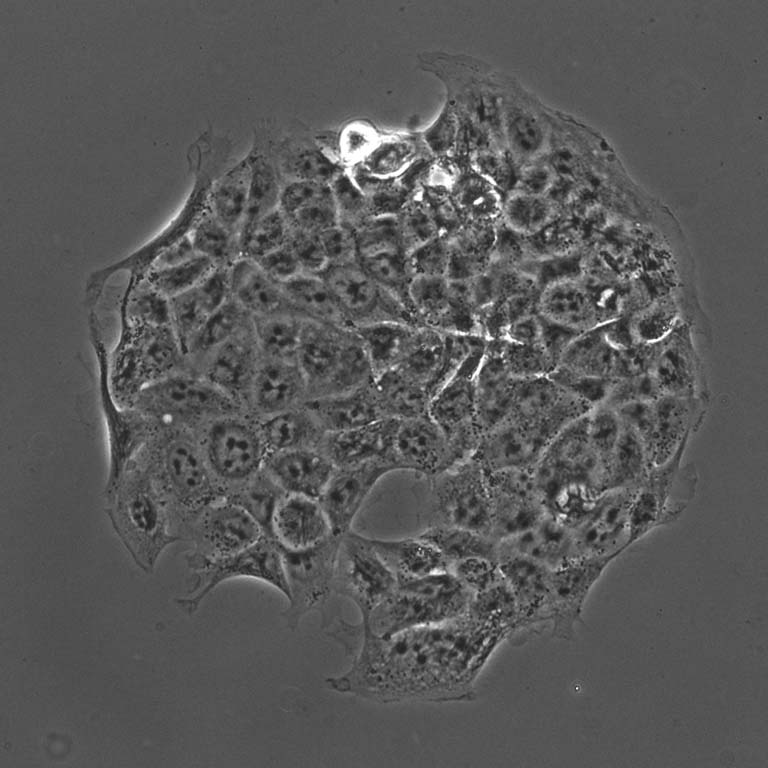 "Extracellular matrix (ECM) molecules are a family of molecules that fill the space around cells. During cancer progression, interactions between cells and their surrounding ECM are perturbed in a manner that permits invasion and metastasis. To understand this process better, we engineered a microarray technology that allows us to query interactions between cells and hundreds of unique combinations of ECM molecules. This image depicts cells adhered to a single island of one ECM combination."