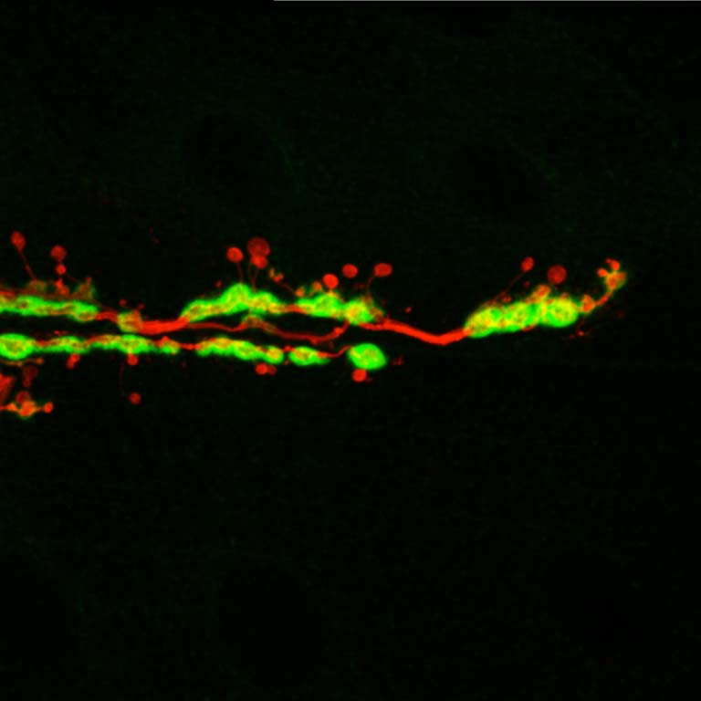 Pictured is a synapse called a neuromuscular junction in the body of a fruit fly larva, where a neuron contacts the muscle it controls. The motorneuron membrane is labeled in red and a postsynaptic scaffold protein within the muscle is labeled in green. This picture shows several neuronal swellings, called boutons, that lack postsynaptic specialization (red without green cloud surrounding). These so-called ghost boutons represent a form of rapid activity-dependent synaptic plasticity that could have implications for the study of learning and memory. We are working to identify the signaling mechanisms that cause ghost bouton budding in response to high activity.