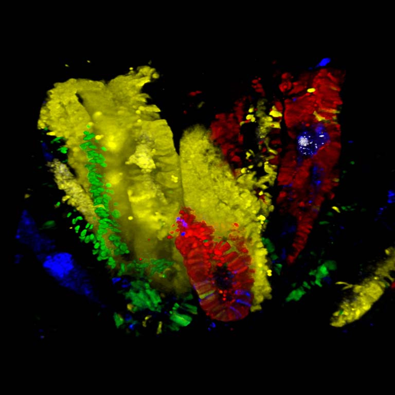 "The image shows the origin of an adenoma, an early stage of intestinal cancer. We took this image to see if the cells that behave as stem cells in healthy intestinal epithelium are also responsible for growth and maintenance of a tumor. By switching the color of a specific cell within an adenoma, we were able to trace their progeny and confirm (cancer) stem cell function. The larger goal of our research is to find better ways to treat cancer. Determining which cells are responsible for tumor growth and learning more about them can provide new leads to develop new treatments."