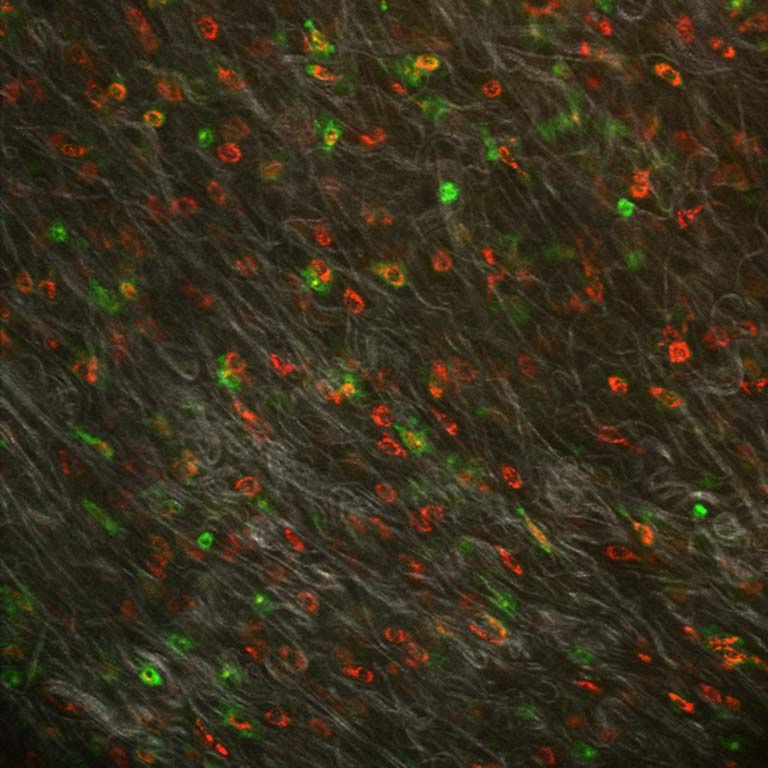 This image was taken to study the effect of ultrasound on the skin immune cells (labeled green) and dispersion/penetration of vaccine antigen (labeled red) into the skin and draining lymph node, along with investigating the uptake of antigen by immune cells (red and green co-localized cells). Low frequency ultrasound (at 20kHz) applied through an aqueous medium on the skin results in bubble formation which collapse to generate microjets impinging on the skin. Microjet impingement on skin activates the skin immune cells and also enhances penetration of topically applied vaccine into skin. This particular image shows the skin imaged from the inner side.