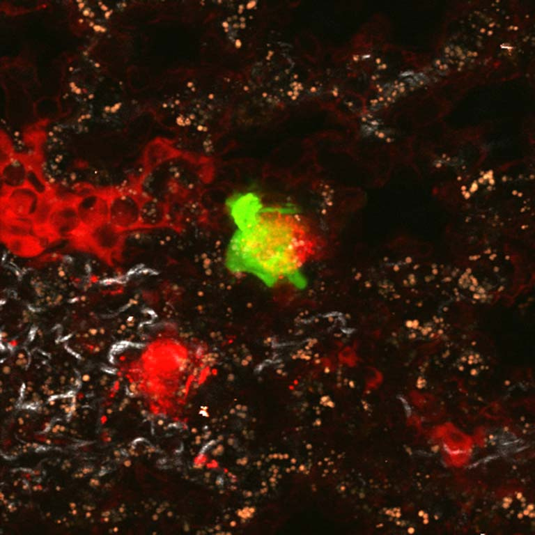 "In this image we are tracking tumor cells as they are making their way from the blood circulation and into the lung in which they form cancer metastases. This image was taken to give us insight regarding the extravasation of tumor cells from the circulation into sites of metastasis in the lung."