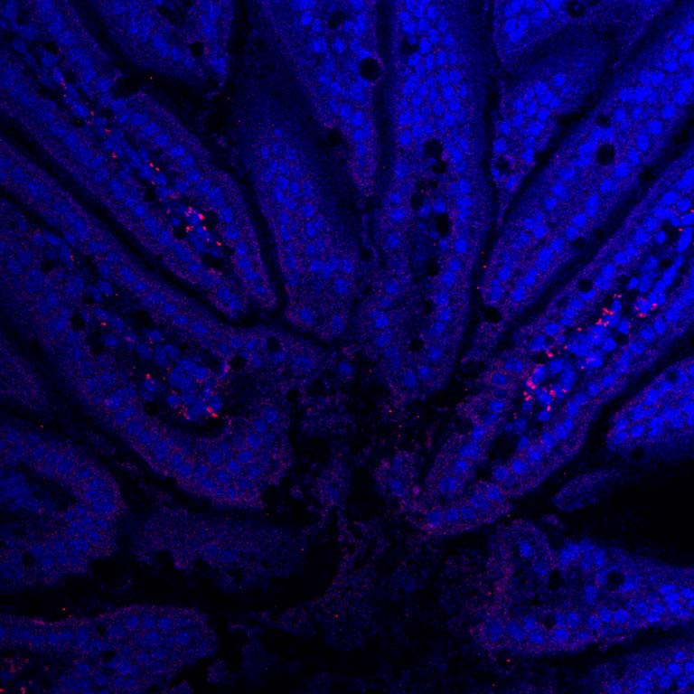Nanoparticles (red) loaded with drugs are passing across the intestines into the bloodstream after oral ingestion. If loaded with insulin, the nanoparticles could be used in an insulin pill that could be taken by mouth for treatment of diabetes.