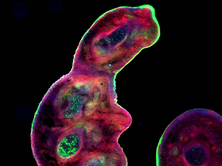 I am trying to determine if Sirt1 is involved in pluripotency or differentiation. The cells with red fluorescent protein are wild type and the cells with green fluorescent protein do not contain the Sirt1 gene. The idea was to see if cells lacking Sirt1 would develop into all the tissue types. The red cells are my control. In this picture you can see that some tissue has more green cells and some have more red cells. This indicates that Sirt1 activity plays a role in determining these cell types.