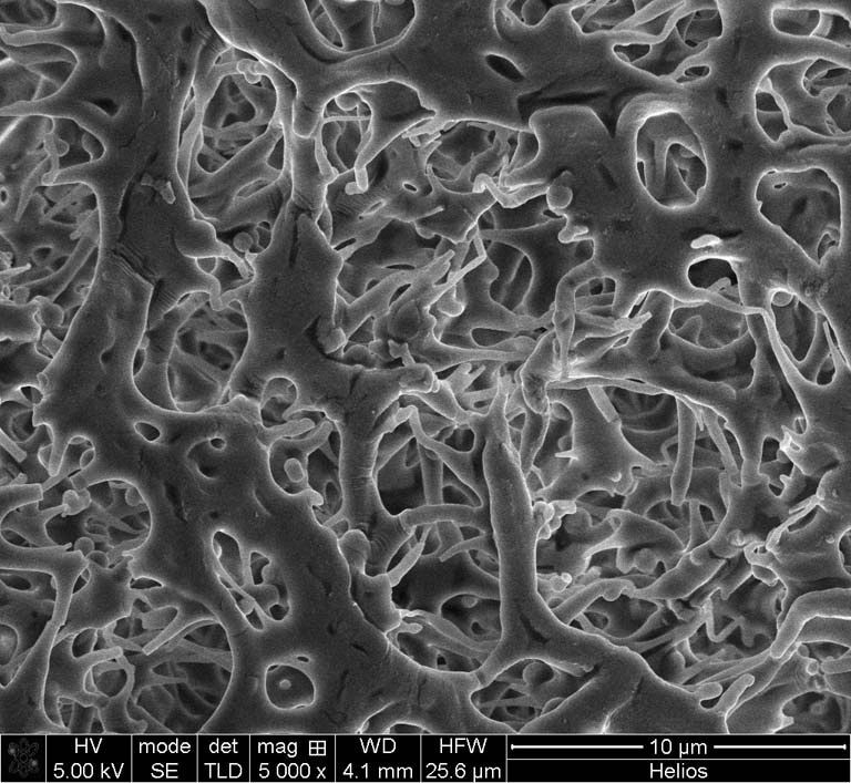 "This is a picture of a new biomaterial we have developed to help treat patients with type 1 diabetes. These materials can protect pancreatic stem cells during transplantation. We hope to use this to allow diabetic patients to receive insulin-producing cells. This material is specially designed to be compatible with the human body, which we accomplish by grafting a seaweed-based polymer called alginate onto the surface. In this image, you can see the material surface is porous to allow for the transport of insulin through the material."