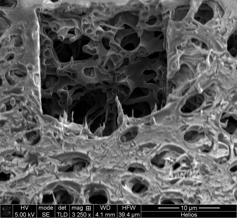 "This is a picture of a new biomaterial we have developed to help treat patients with type 1 diabetes. These materials can protect pancreatic stem cells during transplantation. We hope to use this to allow diabetic patients to receive insulin-producing cells. This material is specially designed to be compatible with the human body, which we accomplish by grafting a seaweed-based polymer called alginate onto the surface. In this image, you can see the material surface is porous to allow for the transport of insulin through the material."