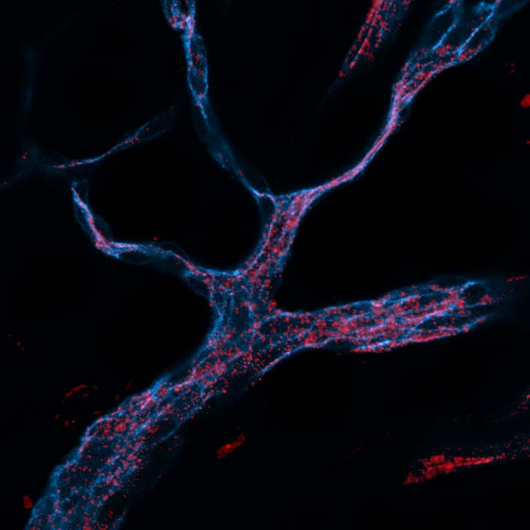 Nanoparticles (in red) can be designed to effectively and specifically deliver drugs to the endothelial cells that line your blood vessels (in blue). This image, of blood vessels in a mouse, was taken in order to learn whether our endothelial-targeting nanoparticles delivered drugs to these cells in vivo. The nanoparticles pictured are in consideration for clinical trials in lung cancer and heart disease.