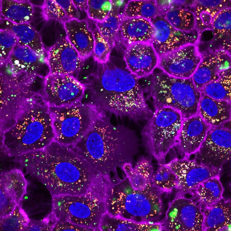 RNA-based gene therapies use short sequences of nucleic acids to silence growth- and survival-promoting proteins only in tumor cells. Unfortunately, conventional delivery vehicles for these exciting new drugs are toxic, limiting their effectiveness in the clinic. The Hammond lab uses polymer chemistry to engineer ‘plastic nanotechnologies’ that can deliver these drugs safely, effectively, and specifically to tumors cells. Here, we’re studying core-shell polymer nanostructures (red, green) that deliver RNA specifically to ovarian cancer cells (purple, blue).