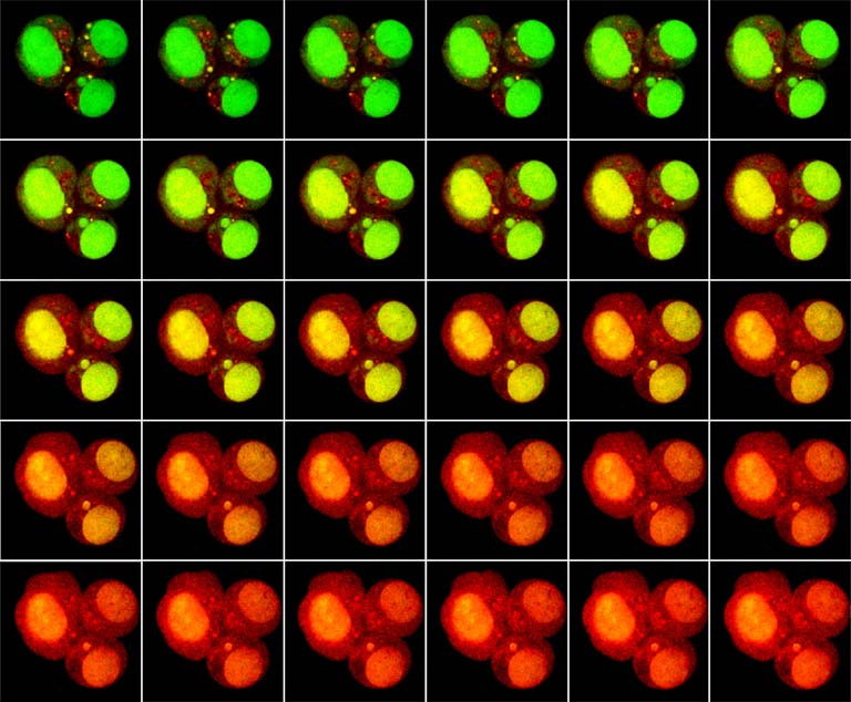 Combination chemotherapy has changed little since its advent in the mid 1960s. Inside cells, the appropriate sequence and ratio of a drug in a cocktail can greatly improve its tumor cell killing; however, traditional delivery methods afford little control over either property. The Johnson Lab (MIT Chemistry) and the Hammond Lab (MIT Chemical Engineering) have teamed-up to develop tiny brush-like polymer nanoparticles that load and release precise ratios of chemotherapeutic drug combinations. This strategy improves the safety profiles of these therapies by decreasing the proportion of drug that goes to healthy tissues. The team has also engineered the polymer to release drug in response to specific colors of laser light, further improving the selectivity of these drug therapies. Here, we observe the chemotherapeutic doxorubicin (red) being delivered to live ovarian cancer cells (nuclei, green) over the course of 30 minutes following laser exposure.