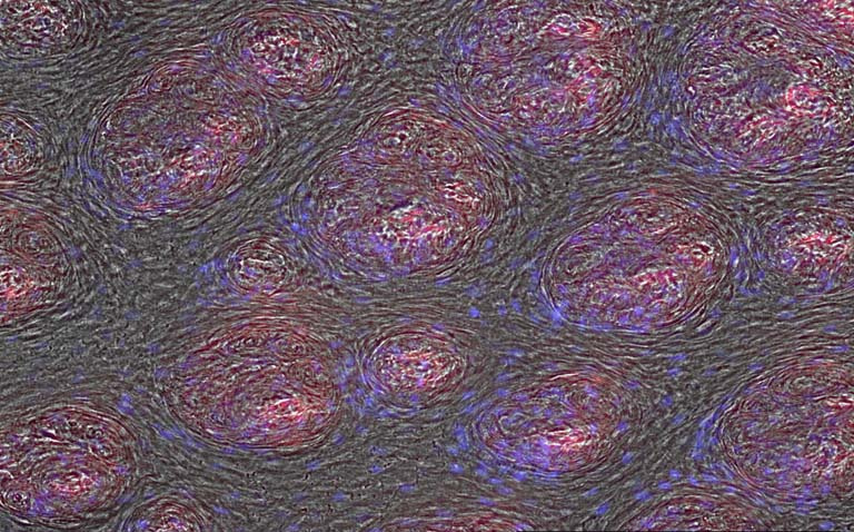This image is the surface of a freshly harvested pig’s tongue. The blue indicates the cells, the red indicates the nanoparticles that permeate into the tongue. We were examining the permeation of our chemotherapeutic nanoparticle in to the tongue for topical treatment of oral cancer. With oral HPV cancer on the rise, we are determined to develop a local anticancer treatment with very limited toxicity. This treatment can be much more effective than the current treatment and has the potential to significantly reduce the systemic side effects of chemotherapy.