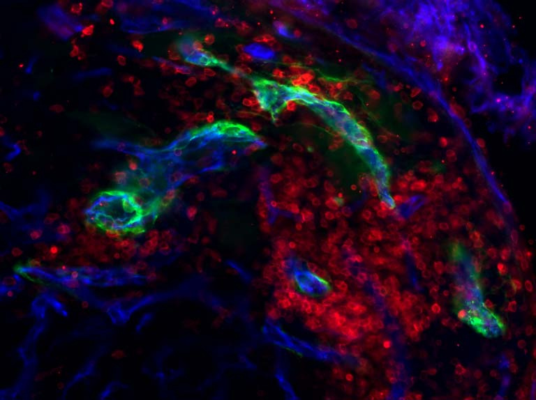 This is an image of high endothelial venules (HEVs) near a tumor. The image was taken to demonstrate that specialized endothelial cells are near tumors that help immune cells enter tumors. Inside the vessel (blue and green) are T cells (red) that are “rolling” through the vessel on their way into the tissue. The tumor cannot be seen in this image, but would be below the field of view.
