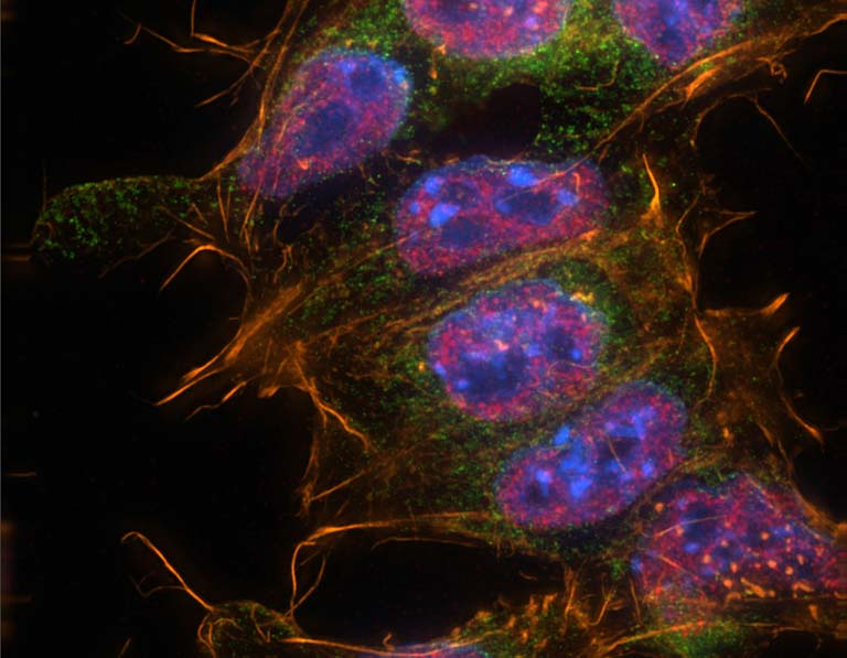 RNA interference (RNAi) is a process by which small, targeted RNA molecules inhibit the expression of a gene. Functional RNAi requires an Argonaute (Ago) protein to bind a small RNA and together this complex targets specific RNAs for degradation. We have engineered a mouse embryonic stem cell line to express a single member of the Ago protein family (Ago2) and visualized its localization within cells alongside other cellular components. In this image, cellular cytoskeleton components (orange), DNA (blue) and a nuclear protein Cpsf6 (red) are visualized alongside Ago2 (green). We are utilizing this cell line to generate Ago2 interaction maps in normal cells in order to understand gene regulation in normal development and disease states. Introduction of small RNA molecules to the RNAi pathway in diseased cells may be employed in the next generation of cancer therapeutics to treat cancer in a specific, targeted manner. This technology holds the promise of therapeutics that exhibit reduced side effects as compared to many current options in cancer treatment.
