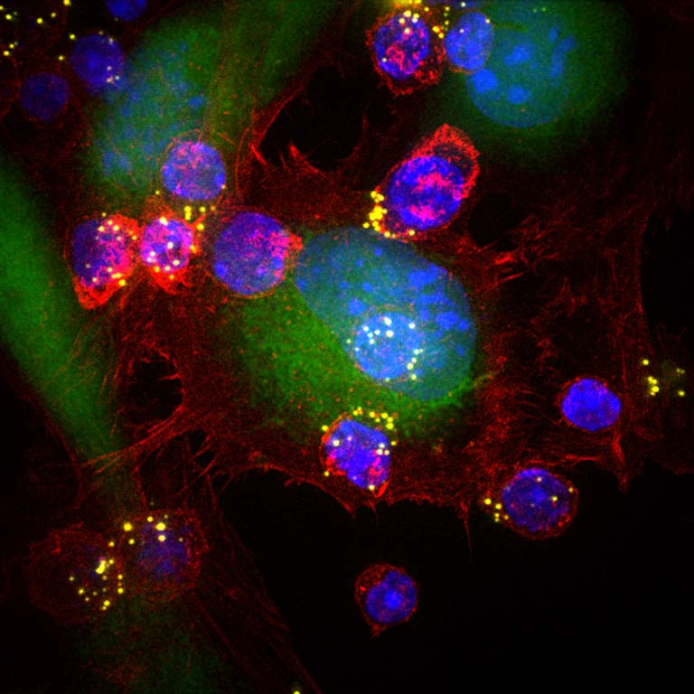 The image shows multiple T cells (small round cells) loaded with nanoparticles (yellow) attacking melanoma tumor cells (green). One potent way of suppressing cancer is by supporting the immune system. This can be achieved by empowering immune cells using nanoparticles carrying drugs that boost their function- an approach also termed as cancer immunotherapy.