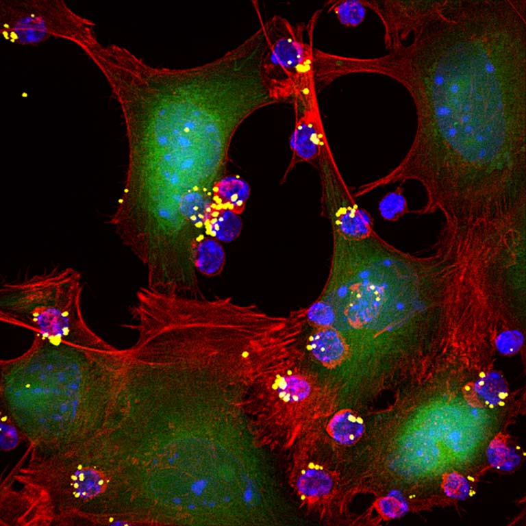 The image shows multiple T cells (small round cells) loaded with nanoparticles (yellow) attacking melanoma tumor cells (green). One potent way of suppressing cancer is by supporting the immune system. This can be achieved by empowering immune cells using nanoparticles carrying drugs that boost their function- an approach also termed as cancer immunotherapy.