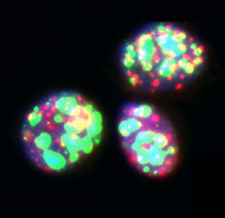 This is a picture of the nuclei of three cancer cells that are undergoing rapid cell death caused by damage to their DNA following treatment with a novel anticancer drug. I took this image to try to elucidate the mechanism(s) behind the antitumorigenic properties of a novel small molecule we are using to treat different types of cancers. Understanding the mechanism(s) through which this small molecule is triggering cell death in cancer cells will allow us to combine this drug with other small molecule inhibitors to increase treatment efficacy of a variety of cancers.