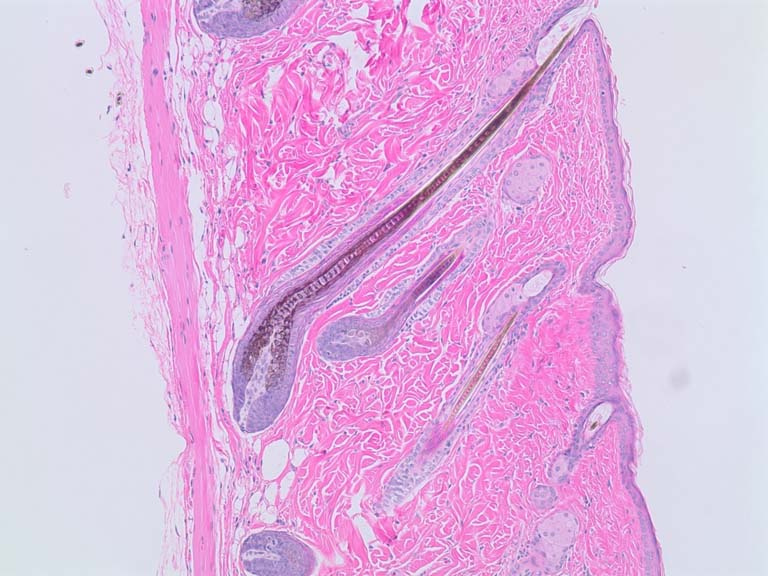 Human & mouse hair follicles go through cycles of growth, death/shrinkage and rest over the lifetime of an individual.This image shows hair follicles from mice with dark coats in the most mature active phase of growing a single hair. The surface of the skin is on the right, and the deepest part of the hair follicle is on the left. Cells at the innermost part of the hair root become increasingly hard, or keratinized, and eventually form the hair shaft. The dark black/brown pigmentation of each hair is provided by melanin, a molecule that is produced by specialized cells called melanocytes, then passed to the cells that will eventually form the hair shaft. In this image specifically, you can see the hair starting to protrude at the surface of the skin.