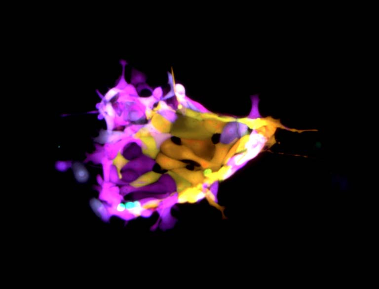 This image shows human mammary epithelial cells marked with combinations of fluorescent proteins that allow us to track their lineage to a common ancestral cell. We study normal human mammary epithelial differentiation, and this experiment allows us to ask basic questions about the relationship between differentiation and proliferation. We were attempting to learn how the differentiation of cells relates to their rate of, and capacity for, cell division.