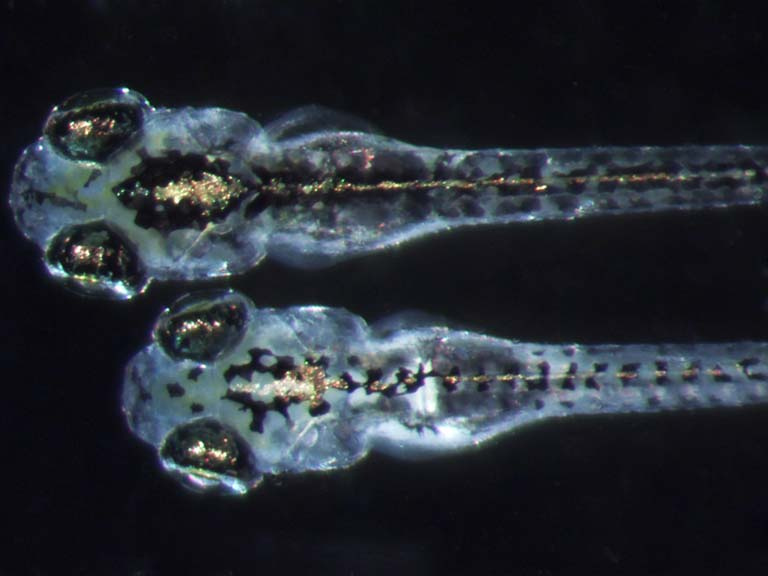 Though humans and fish may seem incredibly different, the zebrafish stripes contain pigmented cells analogous to human melanocytes, melanin containing cells found in eye and skin. Because of these similarities, we were able to construct a zebrafish model of uveal melanoma, a highly metastatic human cancer arising in the eye. The top zebrafish (the bottom fish is a wild type fish control) expresses one of two transgenes harboring mutations detected in 85% of uveal melanoma cases. Expression of the transgene destabilizes the development of the fish melanocytes, thereby giving rise to an aberrant pigment pattern and eventually facilitating tumor formation.