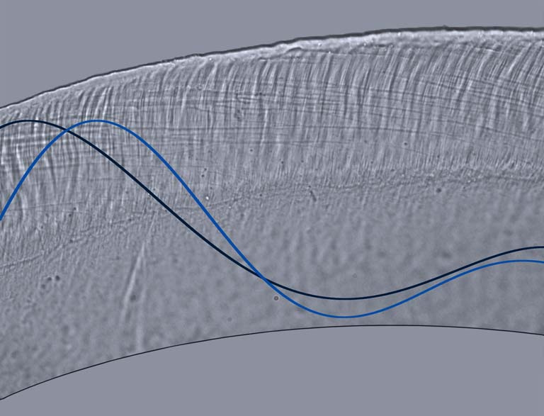 This image is a single frame from a stroboscopic video depicting wave motions on the tectorial membrane––a hydrogel that overlies hair cells in the inner ear. As sound waves enter the ear they are transmitted from the middle ear bones to the fluid filled inner ear, also known as the cochlea. Within the cochlea there are tiny receptors called hair cells that transform this mechanical energy into electrical signals that the brain can interpret. The last mechanical step in this cascade involves the propagation of waves on the tectorial membrane to stimulate these hair cells. Our goal was to understand how the underlying molecular properties of the tectorial membrane contribute to its wave properties and how these in turn contribute to our ability to parse out sounds of different frequencies.