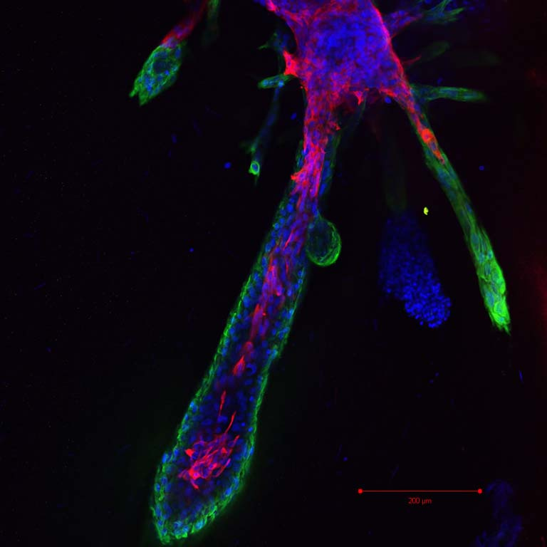 It is very difficult to study the human mammary gland, and although mouse models are widely used in research they do not provide a very accurate depiction of the human mammary gland. We have developed a model in which human mammary cells placed in collagen form structures resembling the mammary gland in vivo (organoids). These organoids were stained with markers specific to different cell types typically seen in the mammary gland. In these images one can see a distinct separation of an outer and inner layer of cells. The organization of these different cell types in the organoids mimicked what is observed in the human mammary gland.