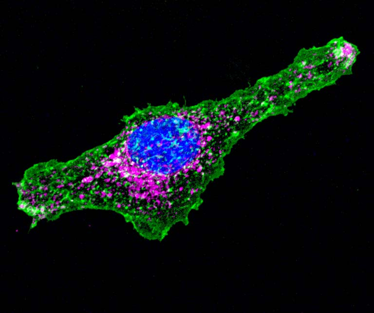 Breast cancer is the second leading cause of cancer-related deaths among women in the U.S. To help improve therapy we are using a component of scorpion venom, named chlorotoxin as way to facilitate specific delivery of therapeutic agents directly into the breast cancer cells. Chlorotoxin can recognize unique cell surface signatures of breast cancer cells and enters these cells carrying with it therapeutic payloads. Our goal is to improve the efficacy of drug delivery into cancer cells while reducing their side effects. In this image the chlorotoxin molecule is shown in magenta, the cell membrane in green, and the nuclei in blue.