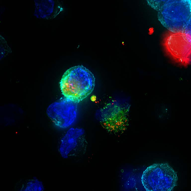 "Rare but mighty, Paneth cells are infrequent yet critical cells of your intestinal lining – they secrete a potent cocktail of natural antimicrobial peptides, helping keep the bacteria in your gut in check. Because of their unique environment, Paneth cells have never before been grown outside the body, until now. Here you can see single polarized mouse Paneth cells packed with antimicrobial peptides (lysozyme – red, cryptidin – green) among other intestinal cells (blue – DAPI, cyan – Actin), all grown in vitro.