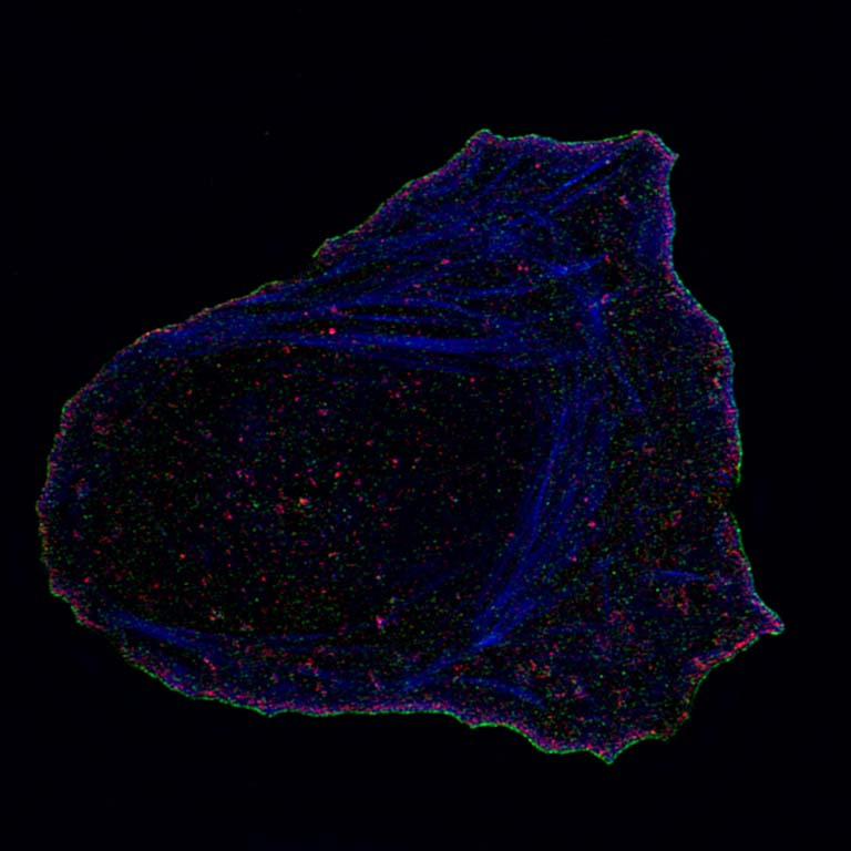 This picture shows a metastatic cancer cell. This cell has been stimulated with a growth factor that activates a signaling pathway leading to lamellipodia protrusion (the protrusion of the cell membrane at the front of the cell is one of the first step in cell motility). The actin cytoskeleton (a critical component of the skeleton of the cell that drive cell migration) is labeled in blue, the Arp2/3 complex, an actin-regulatory complex is labeled in red and Lamellipodin, an actin-regulatory protein, is labeled in green. We are trying to understanding the mechanisms that allow a cancer cell to migrate, invade and metastasize, which is a fundamental problem in the development of effective cures against metastatic carcinomas.