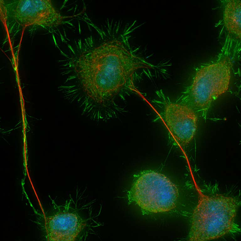 The images show the cytoskeleton of neurons derived from a mouse brain tumor with or without miR-138 genetically removed from their genome. I am studying the role of miRNAs, small regulatory RNAs that control expression of messenger RNAs, in different subcellular regions of neurons. I found that one particular miRNA, when removed from the genome with CRISPR, affects the ability for these neurons to extend neurites. I took these images to help me learn what differences may exist in the underlying cytoskeleton of neurons lacking this miRNA versus wildtype neurons.