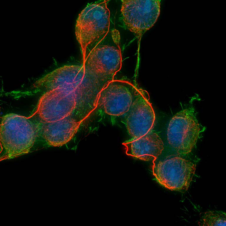 The images show the cytoskeleton of neurons derived from a mouse brain tumor with or without miR-138 genetically removed from their genome. I am studying the role of miRNAs, small regulatory RNAs that control expression of messenger RNAs, in different subcellular regions of neurons. I found that one particular miRNA, when removed from the genome with CRISPR, affects the ability for these neurons to extend neurites. I took these images to help me learn what differences may exist in the underlying cytoskeleton of neurons lacking this miRNA versus wildtype neurons.