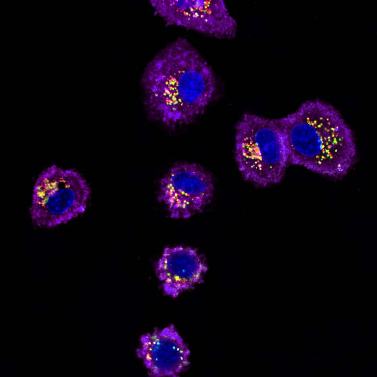 Effective treatments for cancer must minimize harmful side effects, like those that lead to nausea, pain, and hair loss during chemotherapy. Side effects are caused when potent chemotherapy drugs begin to build up in normal, healthy tissue where they cause unwanted damage. We minimize side effects by engineering “smart” drug delivery vehicles that preferentially bind to and accumulate in cancer cells. Here, we show a type of these “smart” drug-vehicles that sticks to and is taken up by ovarian cancer cells grown in the lab. We stained cancer cells with fluorescent dyes that help us identify their different parts – their membrane is colored purple, their nucleus is colored blue, and their lysosomes (tiny organelles that act as the cell’s “stomach”) are colored red. Our nanoparticles are showing up in green, and when the nanoparticles are taken up by the cells they often end up in their lysosome “stomachs”, where the combination of the red and green dyes shows up as yellow.