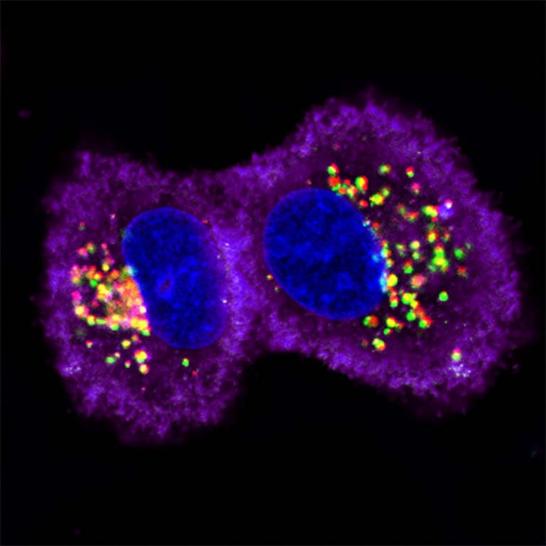 Effective treatments for cancer must minimize harmful side effects, like those that lead to nausea, pain, and hair loss during chemotherapy. Side effects are caused when potent chemotherapy drugs begin to build up in normal, healthy tissue where they cause unwanted damage. We minimize side effects by engineering “smart” drug delivery vehicles that preferentially bind to and accumulate in cancer cells. Here, we show a type of these “smart” drug-vehicles that sticks to and is taken up by ovarian cancer cells grown in the lab. We stained cancer cells with fluorescent dyes that help us identify their different parts – their membrane is colored purple, their nucleus is colored blue, and their lysosomes (tiny organelles that act as the cell’s “stomach”) are colored red. Our nanoparticles are showing up in green, and when the nanoparticles are taken up by the cells they often end up in their lysosome “stomachs”, where the combination of the red and green dyes shows up as yellow.
