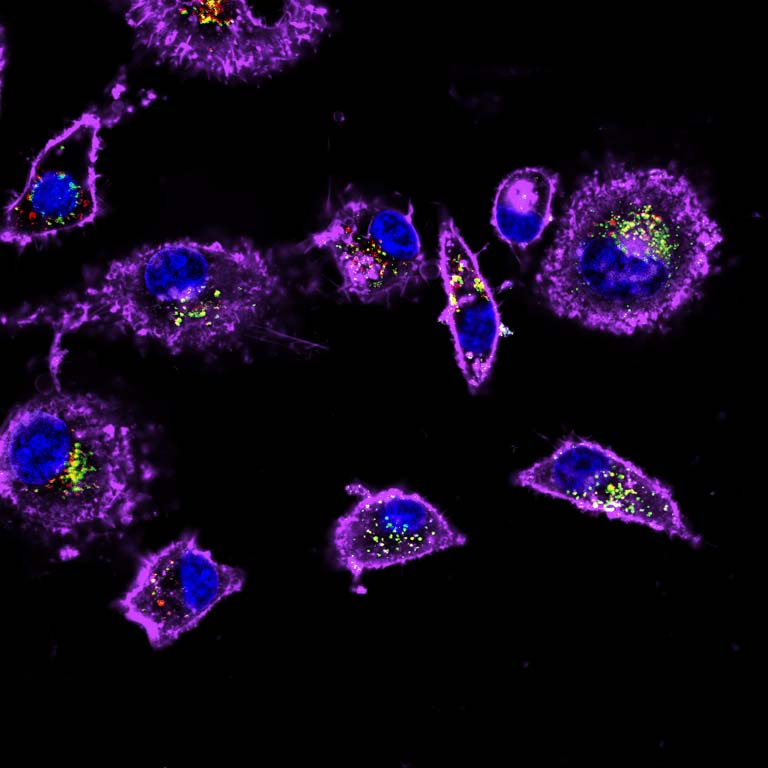 Effective treatments for cancer must minimize harmful side effects, like those that lead to nausea, pain, and hair loss during chemotherapy. Side effects are caused when potent chemotherapy drugs begin to build up in normal, healthy tissue where they cause unwanted damage. We minimize side effects by engineering “smart” drug delivery vehicles that preferentially bind to and accumulate in cancer cells. Here, we show a type of these “smart” drug-vehicles that sticks to and is taken up by ovarian cancer cells grown in the lab. We stained cancer cells with fluorescent dyes that help us identify their different parts – their membrane is colored purple, their nucleus is colored blue, and their lysosomes (tiny organelles that act as the cell’s “stomach”) are colored red. Our nanoparticles are showing up in green, and when the nanoparticles are taken up by the cells they often end up in their lysosome “stomachs”, where the combination of the red and green dyes shows up as yellow.