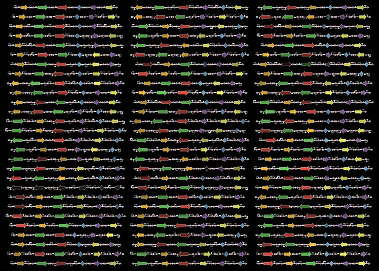 The image shows a collection of 84 artificially engineered DNA sequence designs, with symbols representing each functional element. Every design contains the same 6 genes denoted by large colored arrows that encode several of the cellular machines necessary for nitrogen fixation. The amount that each gene is produced is varied between designs by altering the control elements (monochrome colored parts), and modifying the order and orientation of various segments in the sequence. The color intensity of each gene corresponds to an experimentally measured expression level, with brighter colors representing higher concentrations.
