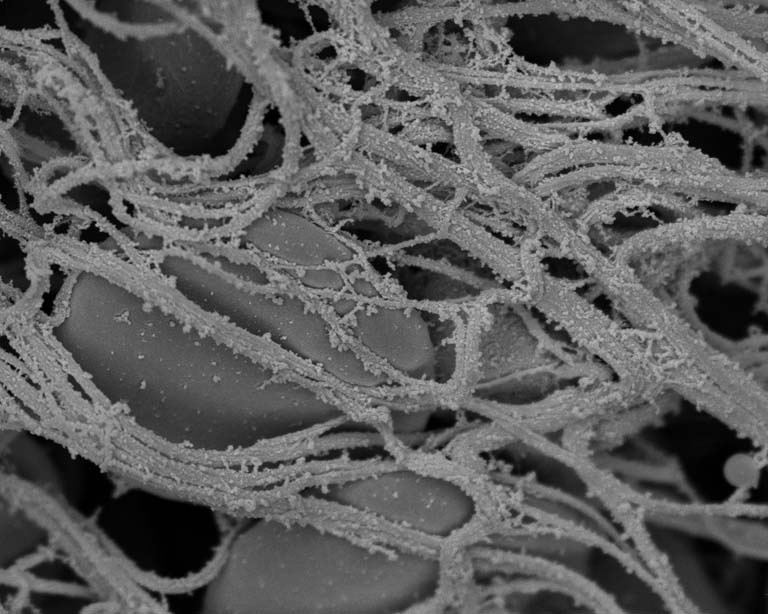 This image shows typical fibrin clot with blood cells. The images in this series show what a blood clot looks like on a microscopic scale. You can see the blood cells mixed in with either fibrin (the naturally occurring protein that assembles to give mechanical strength to a blood clot) or a short peptide (RADA16-I) that spontaneously self-assembles to entrap the blood cells, forming an artificial clot. By taking these images, we wanted to learn how RADA16-I interacted with blood and we found that they appear to do so in a similar fashion to fibrin.