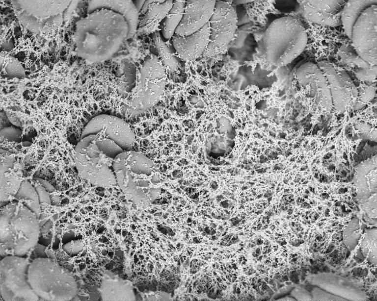 This image shows nanofiber (RADA16-I) clots with blood cells. The images in this series show what a blood clot looks like on a microscopic scale. You can see the blood cells mixed in with either fibrin (the naturally occurring protein that assembles to give mechanical strength to a blood clot) or a short peptide (RADA16-I) that spontaneously self-assembles to entrap the blood cells, forming an artificial clot. By taking these images, we wanted to learn how RADA16-I interacted with blood and we found that they appear to do so in a similar fashion to fibrin.
