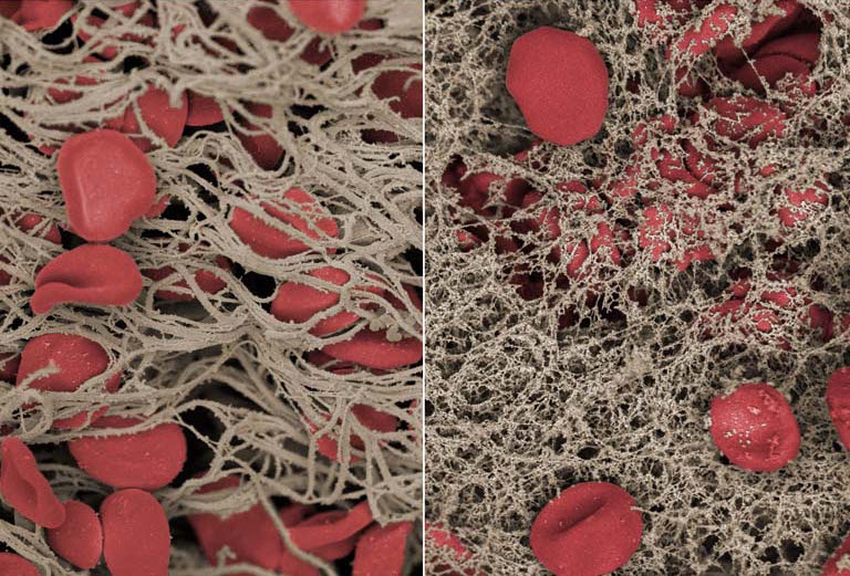 These images show what a blood clot looks like on a microscopic scale. You can see the blood cells mixed in with either fibrin (the naturally occurring protein that assembles to give mechanical strength to a blood clot) (left) or a short peptide (RADA16-I) (right) that spontaneously self-assembles to entrap the blood cells, forming an artificial clot. We have found that the latter can help shorten bleeding times.